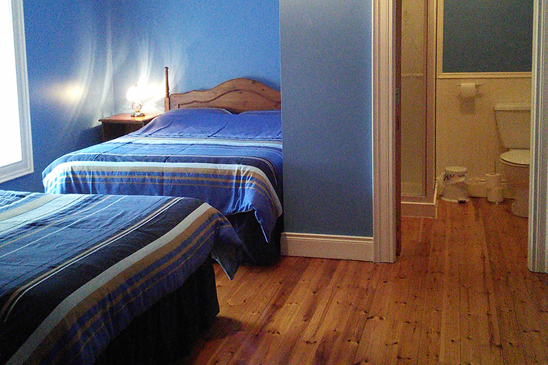 Family ensuite room, 2 double beds, ensuite, TV and free WIFI connection Single occupancy £43 per night. 2 guests £65 per night, (£32.50 per person sharing), 3 or 4 guests charged £30each. Children under 12 years old, half price. Cot available. Looking onto stone built farm yard buildings and countryside.